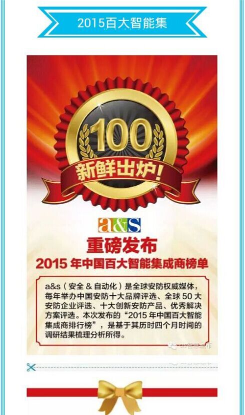由安全&自動(dòng)化雜志承辦,工信部下屬中國(guó)電子學(xué)會(huì)信息系統(tǒng)集成分會(huì)主辦的第一屆百大智慧安防集成商評(píng)選活動(dòng),吸引了來(lái)自智能化產(chǎn)業(yè)的超過(guò)200位高端嘉賓參會(huì),包括政府部門(mén)、國(guó)內(nèi)外知名智能化企業(yè)以及智能化產(chǎn)業(yè)的專(zhuān)家、學(xué)者、企業(yè)高管、技術(shù)總監(jiān)等,經(jīng)過(guò)長(zhǎng)達(dá)4個(gè)月的角逐,我公司從評(píng)選活動(dòng)的6萬(wàn)名智能集成商中脫穎而出,獲得“2015中國(guó)百大智能集成企業(yè)”的榮譽(yù) 。a&s(安全&自動(dòng)化)是全球安防權(quán)威媒體,每年舉辦全國(guó)安防十大品牌評(píng)選、全球50大安防品牌評(píng)選、十大創(chuàng)新安防產(chǎn)品、優(yōu)秀解決方案評(píng)選。本次發(fā)布的“2015年中國(guó)百大集成商排行榜”是經(jīng)過(guò)四個(gè)月調(diào)研結(jié)果梳理分析所得。